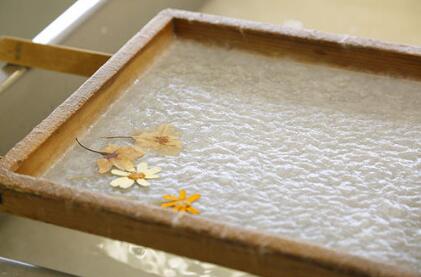 和紙由名為“流漉”的傳統(tǒng)技術(shù)制造而成。將名為“漉舟”的木箱泡在水槽里,通過前后左右不斷晃動而制造出厚度均勻的紙。這種纖維復(fù)雜纏繞而成的和紙,無論是縱向還是橫向都不易破損,柔韌度高,薄而結(jié)實。
