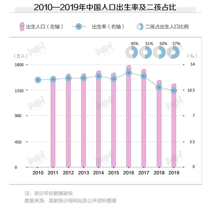 2017年,我國出生人口數量達到1723萬人,其中二孩占比達到51%,首次超過一孩。截至2019年,二孩數量已經連續(xù)三年占據出生人口數量的一半以上。.png)