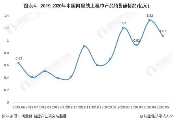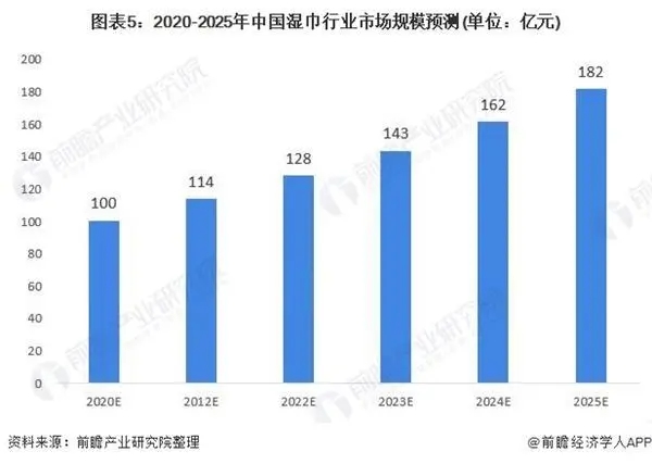 另一方面,2019年底全國疫情的爆發(fā)極大地刺激了濕巾的消費需求。2020年1-5月,阿里濕巾線上銷售額均在1億元左右,2020年4月銷售額更是高達1.32億元,2020年2月環(huán)比增速達到113.63%。此次“新冠疫情”較2003年非典更加嚴(yán)重,進一步激化了國人對衛(wèi)生健康的關(guān)注。同時,隨著我國經(jīng)濟積極向好,居民消費能力及意愿不斷提升,企業(yè)不斷探索制造多元化的濕巾,后疫情時代我國濕巾行業(yè)發(fā)展前景更為明朗,預(yù)計2025年市場規(guī)模有望達到182億元。