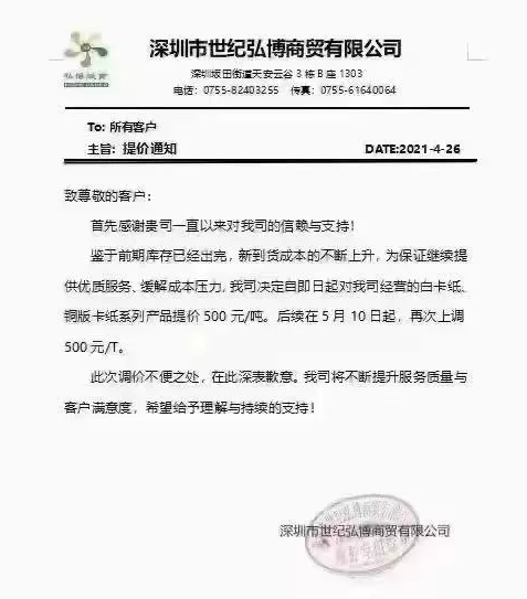 世紀(jì)弘博:即日起對(duì)我司經(jīng)營(yíng)的白卡紙、銅版卡紙系列產(chǎn)品提價(jià)500元/噸。后續(xù)在5月10日起,再次上調(diào)500元/噸。