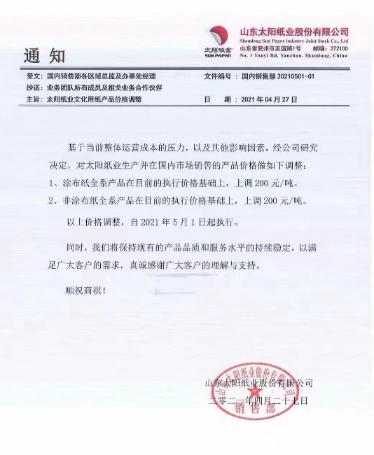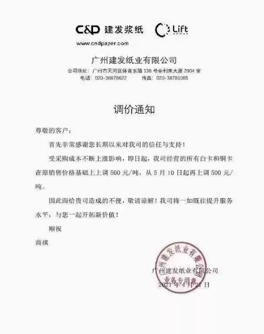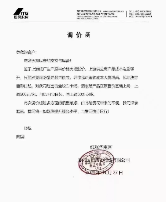 廈門(mén)國(guó)貿(mào)紙張華南區(qū):即日起,對(duì)我司經(jīng)營(yíng)的全線(xiàn)白卡紙、銅版紙產(chǎn)品在原售價(jià)基礎(chǔ)上統(tǒng)一上調(diào)500元/噸。自5月10日起,再上調(diào)500元/噸。