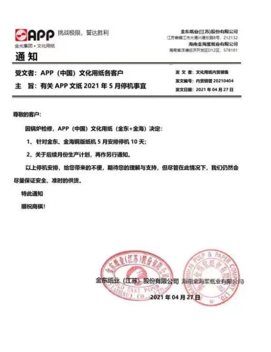 APP文化用紙:因鍋爐檢修,APP(中國(guó))文化用紙(金東+金海)決定: