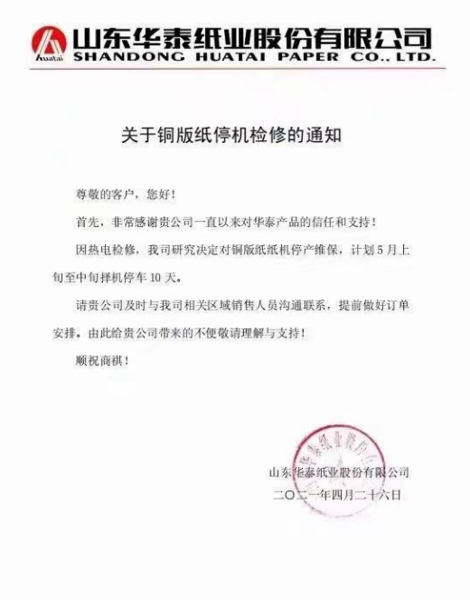 華泰紙業(yè):因熱點(diǎn)檢修,我司研究決定對(duì)銅版紙紙機(jī)停產(chǎn)維保,計(jì)劃5月上旬至中旬擇機(jī)停車(chē)10天。
