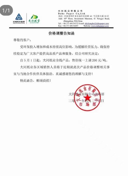 大東紙業(yè):5月1日起,所有產(chǎn)品在目前價(jià)格基礎(chǔ)上統(tǒng)一上調(diào)500元/噸。