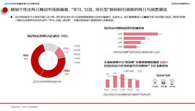 隨著90/95后新生代父母成為育兒主力軍,他們的生活水平以及受教育程度較以往有大幅提升,在觀念上,他們更愿意投入大量精力學(xué)習(xí)科學(xué)育兒知識,媽媽們的育兒理念從依賴傳統(tǒng)經(jīng)驗升級為“學(xué)習(xí)、交流、成長型”,并推動家庭投入更高的育兒消費金額。這些個性化的育兒方式也激活了市場新篇章,95后父母在母嬰用品的月支出占到了家庭月收入的30%。