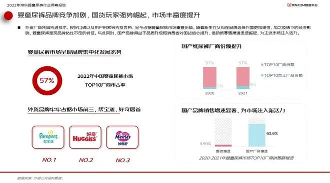 面對市場空間的變化,國內(nèi)嬰童尿褲品牌競爭加劇。其中外資廠商憑借先進技術(shù)、良好口碑以及用戶積累等先發(fā)優(yōu)勢,至今占據(jù)嬰童尿褲市場重要份額。而一方面,隨者新生代父母在品牌選擇方面更加理性,加之疫情下的經(jīng)濟影響,嬰單尿褲也呈現(xiàn)出品牌粘性不足的特征。與此同時,得益于品質(zhì)升級和消費者對國貨信心的提升,國貨品牌借助新零售渠道迅速崛起,為主流市場注入活力。報告顯示,本土頭部廠商份額從2020年的5%迅速提升至2021年的8%,而國產(chǎn)廠商銷售額年增速則達到63.6%,遠超行業(yè)整體增速的4.9%。
