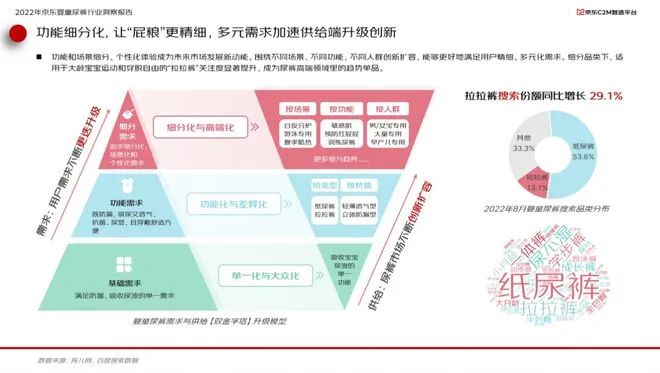 在產(chǎn)品細分賽道方面,功能和場景細分、個性化體驗成為未來市場發(fā)展新動能。圍繞不同場景、不同功能、不同人群創(chuàng)新擴容,能夠更好地滿足用戶精細、多元化的需求。細分品類下,適用于大齡寶寶運動和穿脫自由的“拉拉褲”關(guān)注度顯著提升,成為高端尿褲領(lǐng)域里的趨勢單品。報告顯示,2022年8月,“拉拉褲”關(guān)鍵詞搜索份額同比提升29.1%。讓“屁糧"更精細,多元需求加速供給端升級創(chuàng)新。