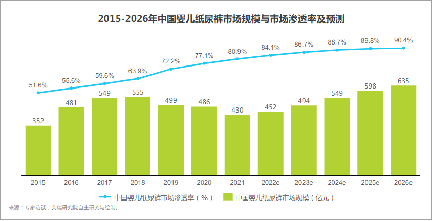以嬰兒紙尿褲市場為例,該品類的市場滲透率從2015年的51.6%增加到2022年的84.1%,預(yù)計(jì)到2026將升至90.4%。