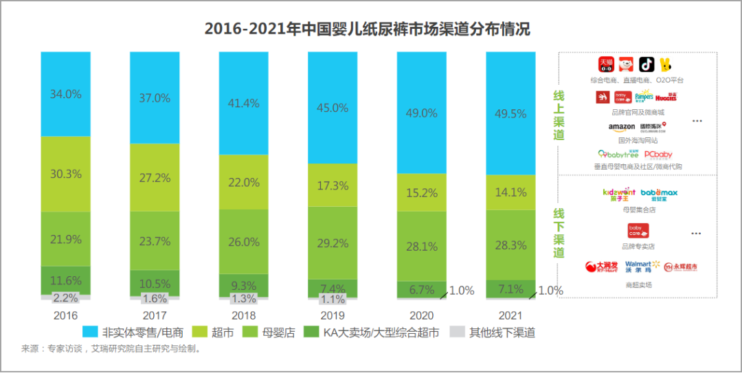 同樣以紙尿褲為例。來自艾瑞咨詢數(shù)據(jù)顯示,2021年嬰兒紙尿褲市場線上渠道占比達(dá)49.5%,超過母嬰店的28.3%和超市的14.1%。