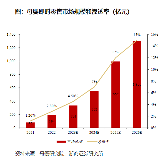 年輕母嬰用戶對于“即時(shí)性”“便捷化”的追求,推動(dòng)母嬰即時(shí)零售渠道的狀態(tài),截止2022年該渠道規(guī)模約194億元,預(yù)計(jì)2026年將達(dá)1305億元,年復(fù)合增長74%,勢頭尤為猛烈。