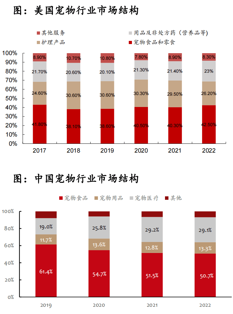 從寵物行業(yè)產(chǎn)業(yè)結(jié)構(gòu)來看,根據(jù)APPA的數(shù)據(jù),美國寵物用品、OTC藥品和活體動物市場規(guī)模占美國寵物行業(yè)總規(guī)模的比例平均約為22%,對標(biāo)美國市場,目前中國寵物用品規(guī)模占比仍有很大的增長潛力與空間。