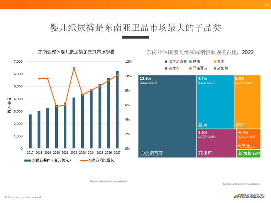 眾多紙尿褲品牌對東南亞市場情有獨鐘背后,是可觀的市場前景。根據(jù)Euromonitor(歐睿信息咨詢)數(shù)據(jù)顯示,2022年東南亞一次性衛(wèi)品市場整體零售額達到了65億美元,其中嬰兒紙尿褲是東南亞衛(wèi)品市場最大的子品類,去年市場規(guī)模超過了40億美元,21-22年同比增長達到將近11%。預(yù)計2027年嬰兒紙尿褲市場會超過60億美元。