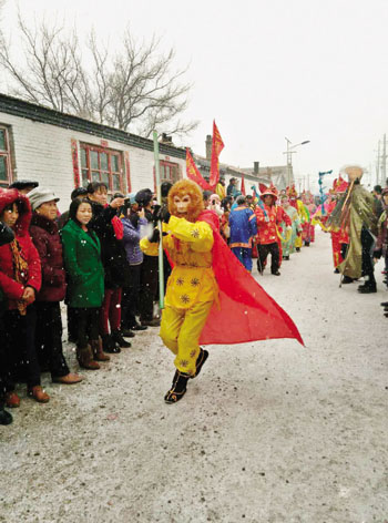2月12日,農(nóng)歷正月初五,五寨縣前所鄉(xiāng)南坪村正在進行的八大角秧歌表演,村民們冒著風雪駐足觀看。圖為一村民扮演的美猴王。(許凈 攝)