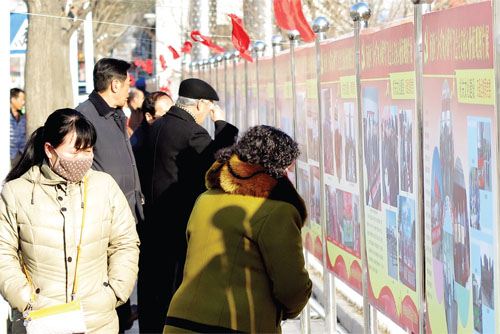 2月21日,忻府區(qū)區(qū)委、區(qū)政府門前“踐行社會主義核心價值觀”圖片展,吸引了眾多市民觀看學習。 (張志遠 攝)