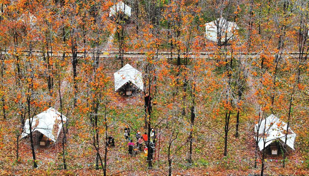 樹(shù)上生產(chǎn)力,樹(shù)下購(gòu)買(mǎi)力。霜降時(shí)節(jié),位于定襄縣東峪自然保護(hù)區(qū)戎家莊的露營(yíng)基地柿林內(nèi),村民忙著在樹(shù)上摘柿子,游客等著在樹(shù)下買(mǎi)柿子,給這個(gè)美麗的秋天,編織出一幅祥和的圖景。(張晉蘭 攝)