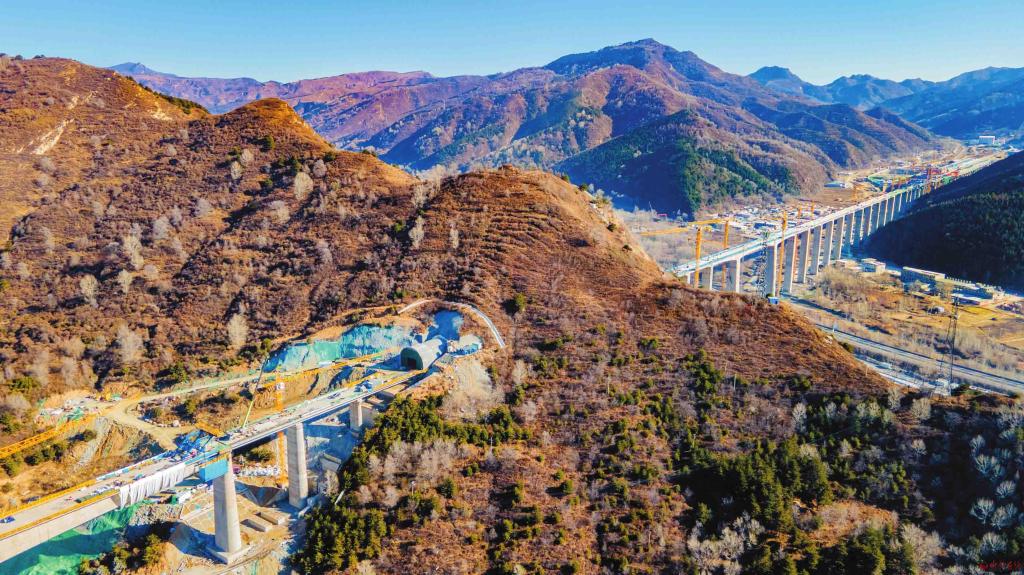 11月14日,雄忻高鐵五臺山段工程建設(shè)正在全速推進。航拍鏡頭下,高鐵線路蜿蜒穿行太行層巒,與深秋遺韻、初冬新寒相映,盡顯基建與生態(tài)協(xié)調(diào)的壯美圖景。(記者范琛攝)