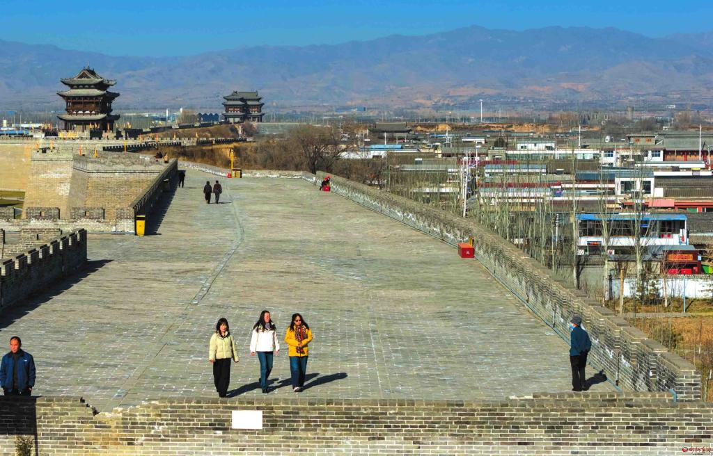 代州古城西城墻歷經(jīng)多年保護(hù)性修繕,是古城目前唯一修復(fù)完整并對外開放的城墻段落。圖為12月1日,游人登上西城墻游覽觀光。(