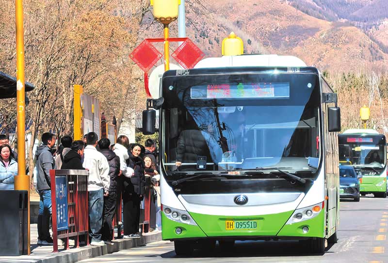 五臺(tái)山景區(qū)公交便捷惠民,核心區(qū)域?qū)嵭忻赓M(fèi)乘坐,班次密集、覆蓋全域,為自由行游客出行保駕護(hù)航。圖為游客正在有序乘車。(記者 張存良攝)