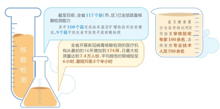 利用核酸檢測開展大范圍篩查,是精準(zhǔn)防控疫情的有效手段。省衛(wèi)健委醫(yī)政醫(yī)管局四級調(diào)研員趙宏介紹,全省開展新冠病毒核酸檢測的醫(yī)療機(jī)構(gòu)從最初的14所增加到174所,日最大檢測量達(dá)到7.4萬人份,平均報(bào)告時(shí)限縮短至6小時(shí),最短只需2個半小時(shí)。