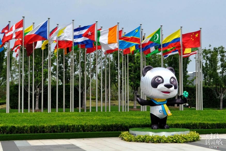 △7月27日,第三屆進博會倒計時100天,場館外參展國國旗飄揚。