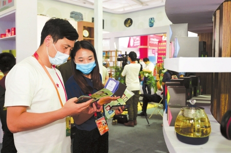 我省展商正向觀展者介紹“槐花苦蕎茶”的功效。