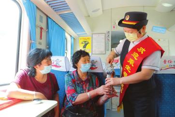 乘務(wù)員在蔡家崖號(hào)列車(chē)上為旅客提供服務(wù)。