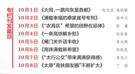 高鐵速度跑出了便捷和美好,并京“同城”夢想成真,成為“速度改變生活”的樣本,京晉經濟文化交流更加密切;“蔡家崖號”穿行呂梁山間,為沿線貧困地區(qū)提供著源源不斷的脫貧助力,帶來看得見的變化、穩(wěn)得住的幸福。今年國慶期間,本報開設《坐著火車看山西》專欄,記者踏上火車,體驗生活,假期8天刊發(fā)8篇稿件,展示“十三五”期間我省經濟社會發(fā)展的巨大變化。