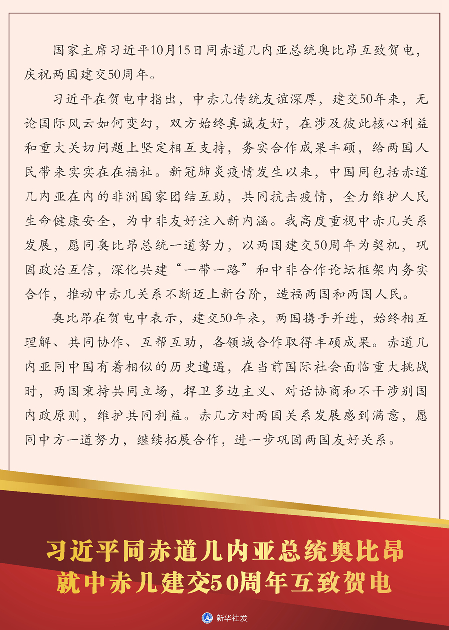 新華社北京10月15日電 國(guó)家主席習(xí)近平10月15日同赤道幾內(nèi)亞總統(tǒng)奧比昂互致賀電,慶祝兩國(guó)建交50周年。