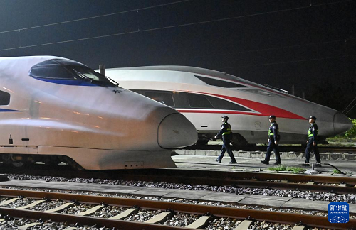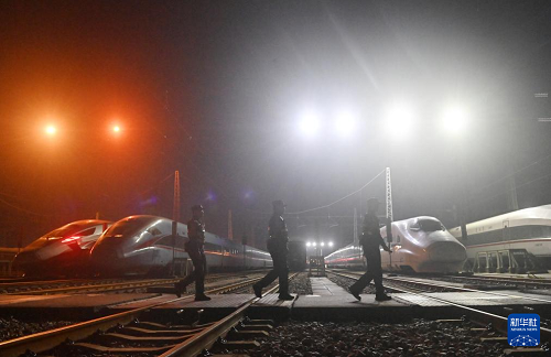 2月2日凌晨,南寧鐵路公安局南寧公安處長崗嶺站派出所民警在南寧動車所巡邏。(新華社記者 陸波岸 攝)