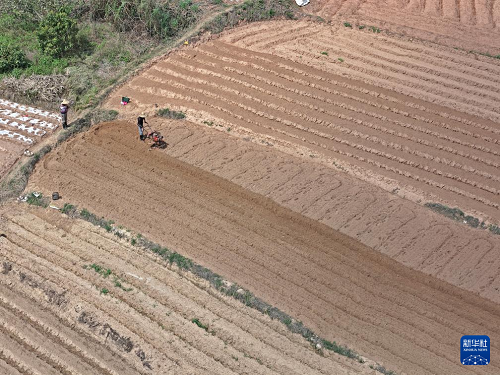 3月1日,村民在廣西南寧市邕寧區(qū)蒲廟鎮(zhèn)田園里耕作(無人機(jī)照片)。(新華社記者 周華 攝)