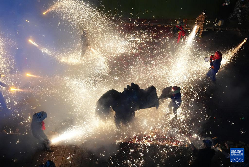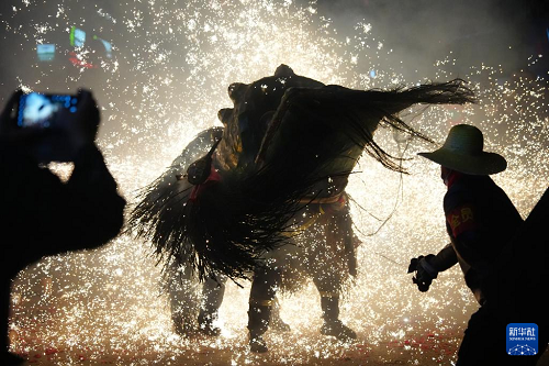 3月2日,在陜西旬陽(yáng)市蜀河鎮(zhèn)蜀河社區(qū),表演人員在用煙花“燒獅子”。(新華社記者 邵瑞 攝)