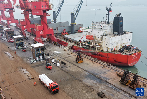 春耕農(nóng)忙時節(jié),江蘇連云港港暢通農(nóng)用物資綠色通道,對化肥等農(nóng)資做到隨到隨卸,裝車運輸全程高效流水作業(yè),確保春耕農(nóng)資供應。