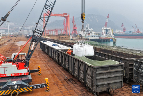 3月4日,工人在江蘇連云港港東方港務(wù)分公司碼頭鐵路裝車點將化肥裝上貨運專列(無人機照片)。(新華社發(fā) 王健民 攝)