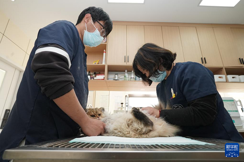 2月3日,在無錫關(guān)愛寵物醫(yī)院,醫(yī)護(hù)人員給寵物貓?zhí)昝?。(新華社發(fā) 劉臻睿 攝)