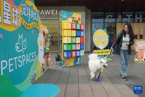 3月15日,在無錫市運(yùn)河匯街區(qū),一位女士帶著寵物狗參加活動。(新華社發(fā) 劉臻睿 攝)