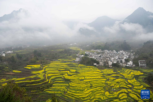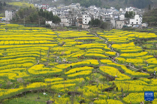 眼下,安徽省宣城市績(jī)溪縣家朋鄉(xiāng)幸福村的油菜花田進(jìn)入盛花期,大批游客來(lái)此踏青賞花。
