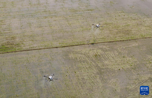 3月24日,在廣東江門臺山市都斛鎮(zhèn),農(nóng)業(yè)無人機(jī)在插好秧苗的田間作業(yè)(無人機(jī)照片)。(新華社記者 毛思倩 攝)