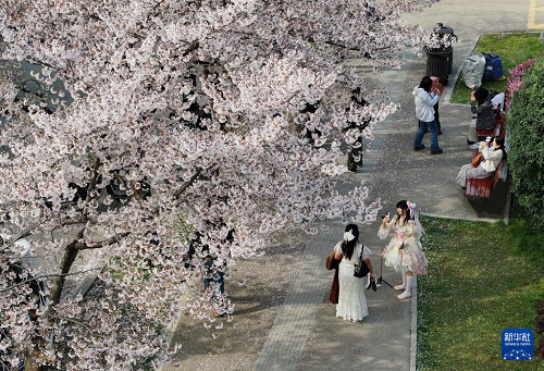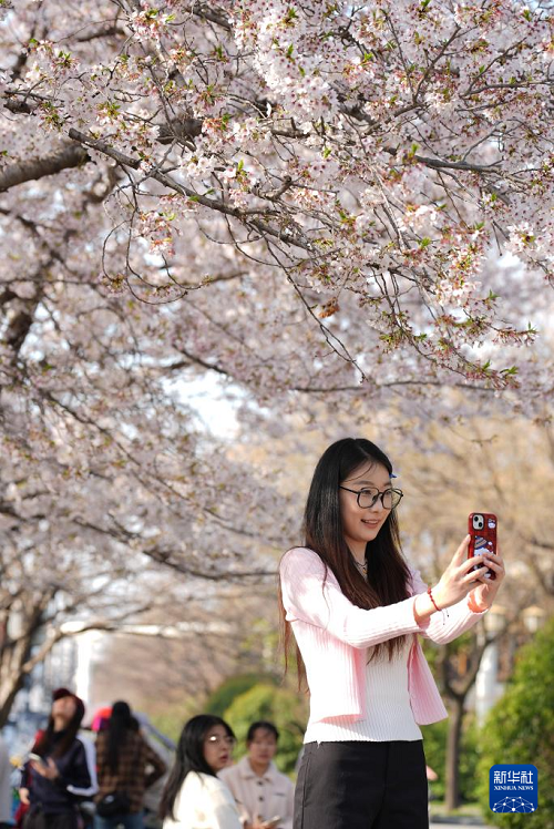 3月24日,游人在西安市雁塔區(qū)曲江池西路的櫻花樹(shù)下拍照。(新華社記者 邵瑞 攝)