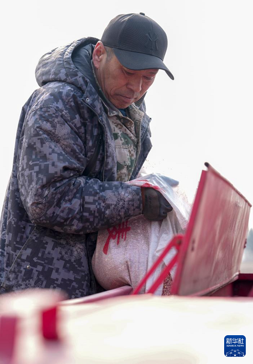 3月25日,農(nóng)戶在位于黑龍江省哈爾濱市的北大荒集團(tuán)閆家崗農(nóng)場有限公司一處地塊將麥種加入播種機(jī)中。(新華社記者 王松 攝)