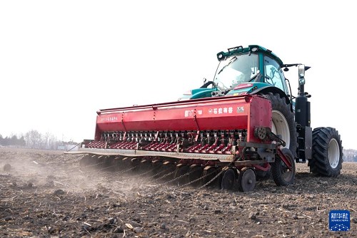 3月25日,播種機(jī)在位于黑龍江省哈爾濱市的北大荒集團(tuán)閆家崗農(nóng)場有限公司一處耕地上根據(jù)設(shè)定程序播種小麥。(新華社記者 王松 攝)