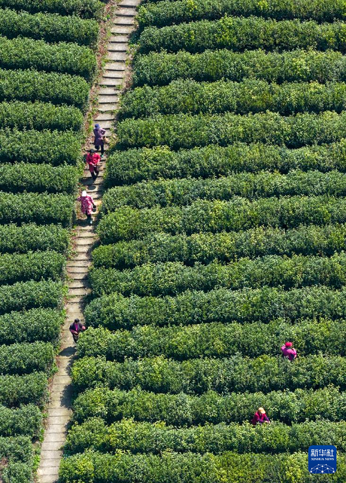 3月29日,采茶工在浙江省玉環(huán)市大麥嶼街道石峰山火山茶基地采摘明前茶。(新華社發(fā) 段俊利 攝)