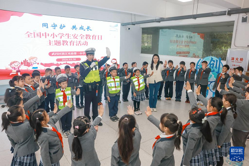3月30日,在湖北省武漢市武昌區(qū)濱江實(shí)驗(yàn)第一小學(xué),交警指導(dǎo)學(xué)生體驗(yàn)交通安全手勢操。(新華社發(fā) 趙軍 攝)