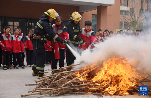 3月30日,在山東省臨沂市沂南縣第六實(shí)驗(yàn)小學(xué),消防救援人員指導(dǎo)學(xué)生正確使用滅火器滅火。(新華社發(fā) 王彥冰 攝)