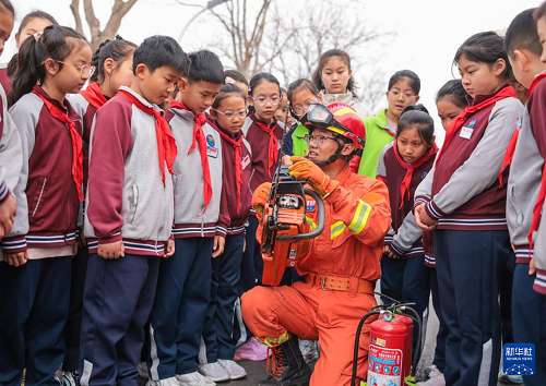 3月30日,在山東省榮成市府新小學(xué),消防救援人員為學(xué)生展示消防破拆工具的使用方法。(新華社發(fā) 李信君 攝)