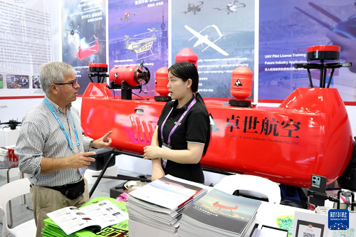 4月15日,外商在廣交會現(xiàn)場咨詢了解消防無人機。(新華社記者 盧漢欣 攝)