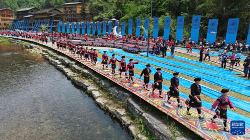 4月19日,在廣西桂林市龍勝各族自治縣龍脊鎮(zhèn)金江村黃洛瑤寨,當(dāng)?shù)厝罕妳⒓印癟臺(tái)秀”(無人機(jī)照片)。(新華社發(fā) 韋吉陽 攝)