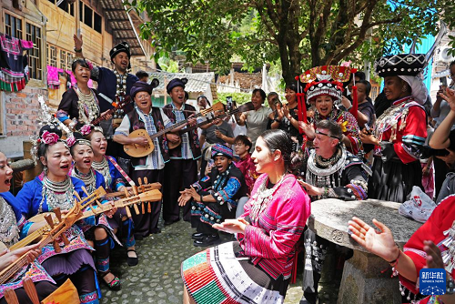 4月19日,在廣西桂林市龍勝各族自治縣龍脊鎮(zhèn)金江村黃洛瑤寨,當(dāng)?shù)厝罕姾屯鈬?guó)友人對(duì)山歌。(新華社發(fā) 韋吉陽 攝)