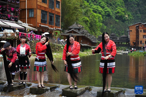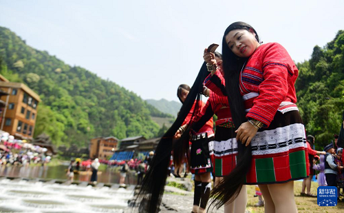 4月19日,在廣西桂林市龍勝各族自治縣龍脊鎮(zhèn)金江村黃洛瑤寨,瑤族婦女在河邊展示長(zhǎng)發(fā)梳妝。(新華社發(fā) 韋吉陽 攝)