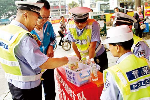 考試期間,市公安局交警支隊(duì)在各考點(diǎn)設(shè)置了便民服務(wù)點(diǎn),備好遮陽(yáng)傘、雨傘、保溫水桶、礦泉水和考試專(zhuān)用的鋼筆、橡皮。便民服務(wù)臺(tái)還放置一個(gè)小藥箱,里面?zhèn)溆星鍥鲇?、防暑藥、藿香正氣水、感冒藥、腹瀉藥、速效救心丸、降壓藥等應(yīng)急藥品,以防考生及家長(zhǎng)急用。