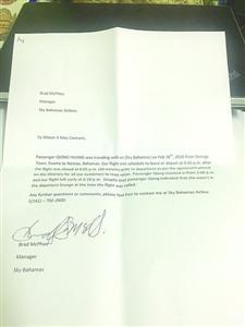 SkyBahamas航空公司給黃小姐開了一張情況說明,稱飛機(jī)確實早于18點45分起飛。